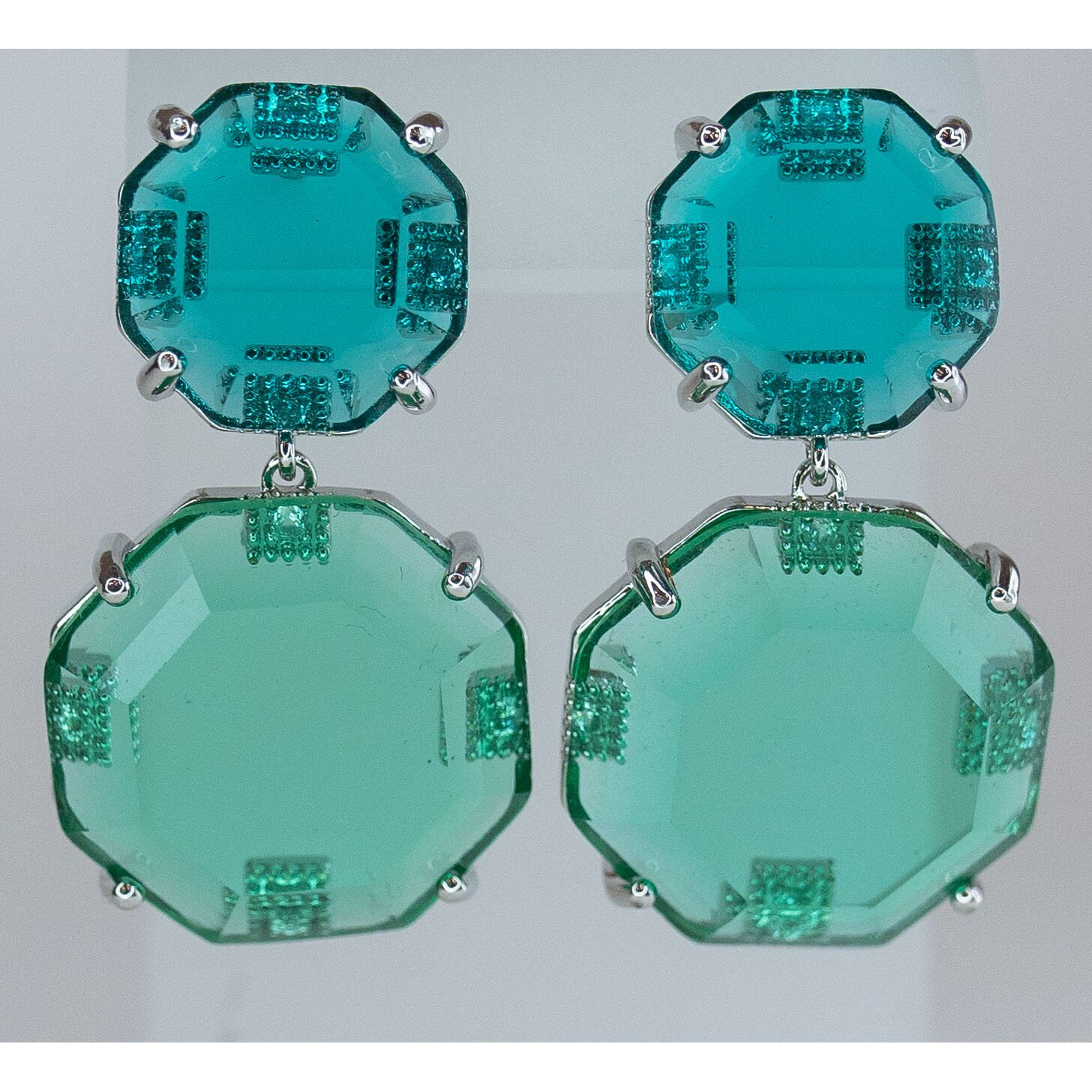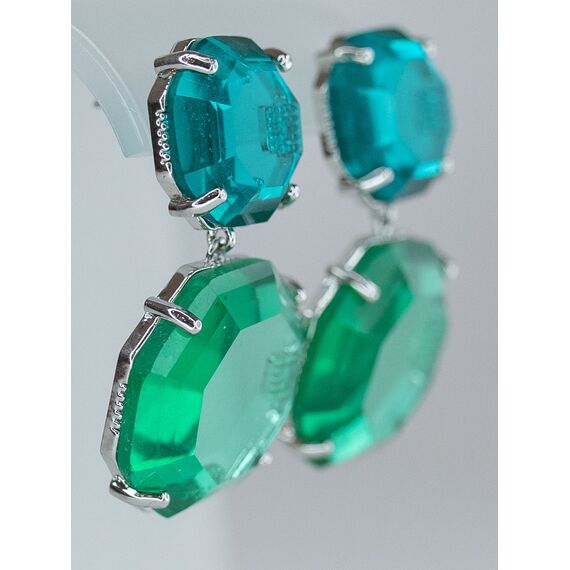 Серьги из гипоаллергенного ювелирного сплава серого цвета. Вставка- ювелирное стекло, цвет- зеленый. Высота серег-4,0см, ширина-2,0см. Застежка- пусет.