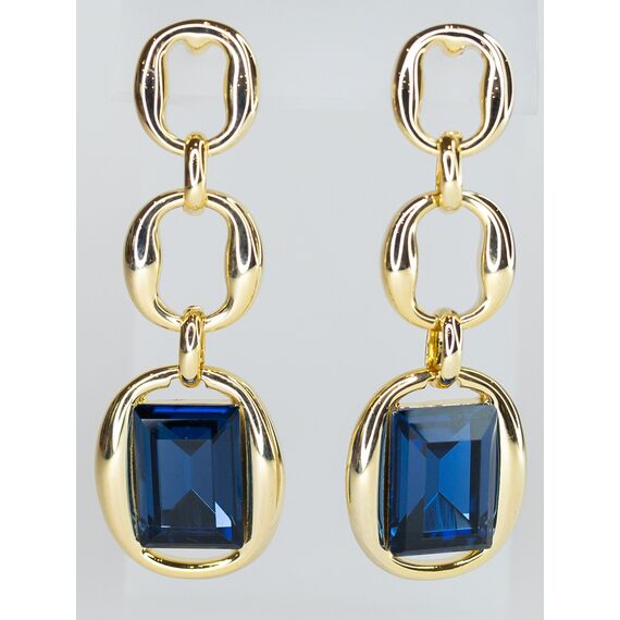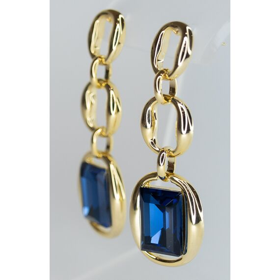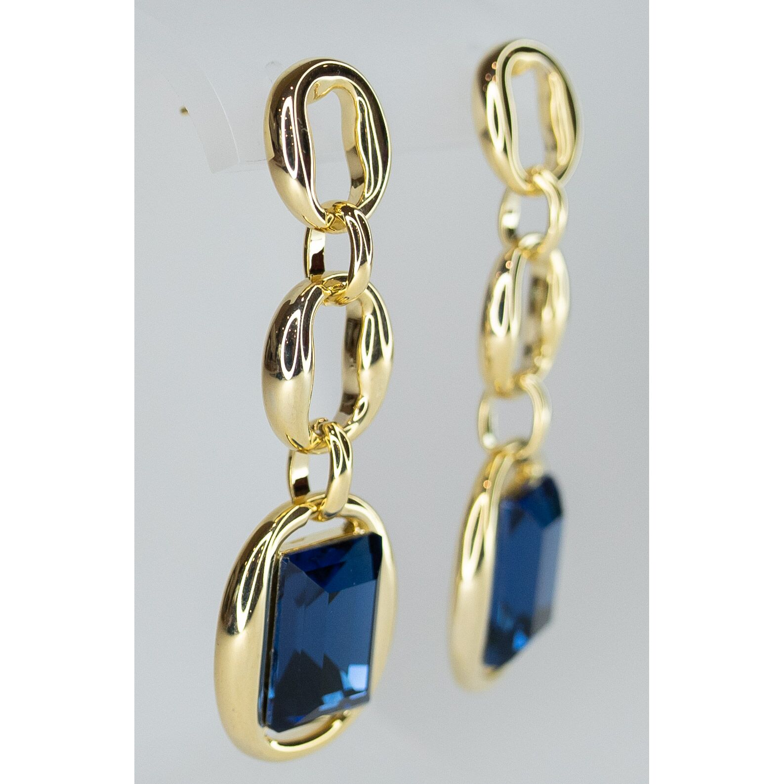Серьги из гипоаллергенного ювелирного сплава желтого цвета. Вставка- ювелирное стекло, цвет- синий. Высота серег-4,0см, ширина-1,5см. Застежка- пусет.