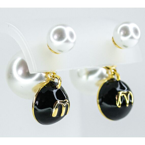 Серьги из гипоаллергенного ювелирного сплава желтого цвета. Вставка- жемчуг белого цвета. Покрытие эмалью черного цвета. Высота серег-2,0см, ширина-1,0см. Застежка- пусет.