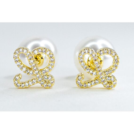 Серьги из гипоаллергенного ювелирного сплава желтого цвета. Вставка- циркон и жемчуг белого цвета. Высота серег-1,0см, ширина-1,0см. Застежка- пусет.