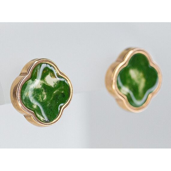 Серьги из гипоаллергенной бронзы с позолотой. Вставка- нат.янтарь зеленого цвета ( размер камня-1,0/1,0см). Высота серег-1,0см, ширина-1,0см. Застежка- пусет.