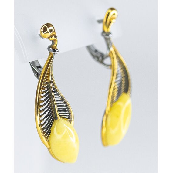 Серьги из гипоаллергенной бронзы с чернением и позолотой. Вставка- нат.янтарь белого цвета ( размер камня-1,0/0,8см). Высота серег-4,0см, ширина-1,0см. Застежка- английская ( швенза-1,0см).
