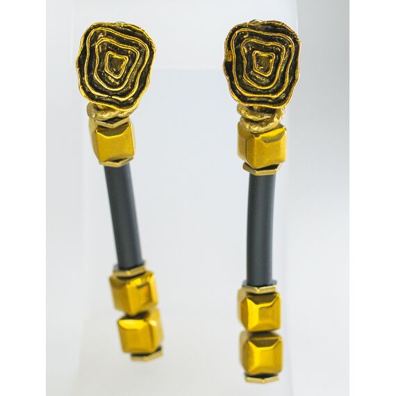 Серьги из гипоаллергенного ювелирного сплава желтого цвета на черном каучуке. Вставка- гематит желтого цвета. Высота серег-7,0см, ширина-1,0см. Застежка- пусет.