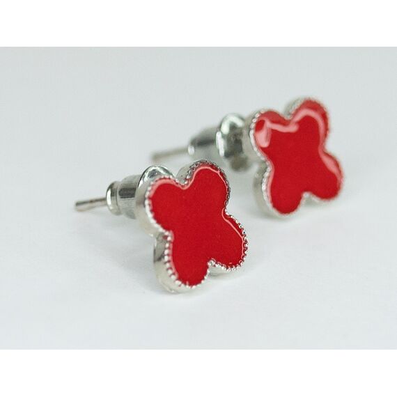 Серьги из гипоаллергенного ювелирного сплава серого цвета. Вставка- ювелирный пластик красного цвета. Высота серег- 1,0см, ширина- 1,0см. Застежка- пусет.