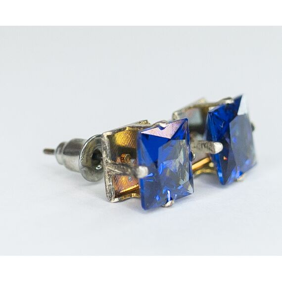 Серьги женские из гипоаллергенного ювелирного сплава серого цвета. Вставка- ювелирное стекло синего цвета. Высота серег--1,0см, ширина- 1,0см. Застежка- пусет.