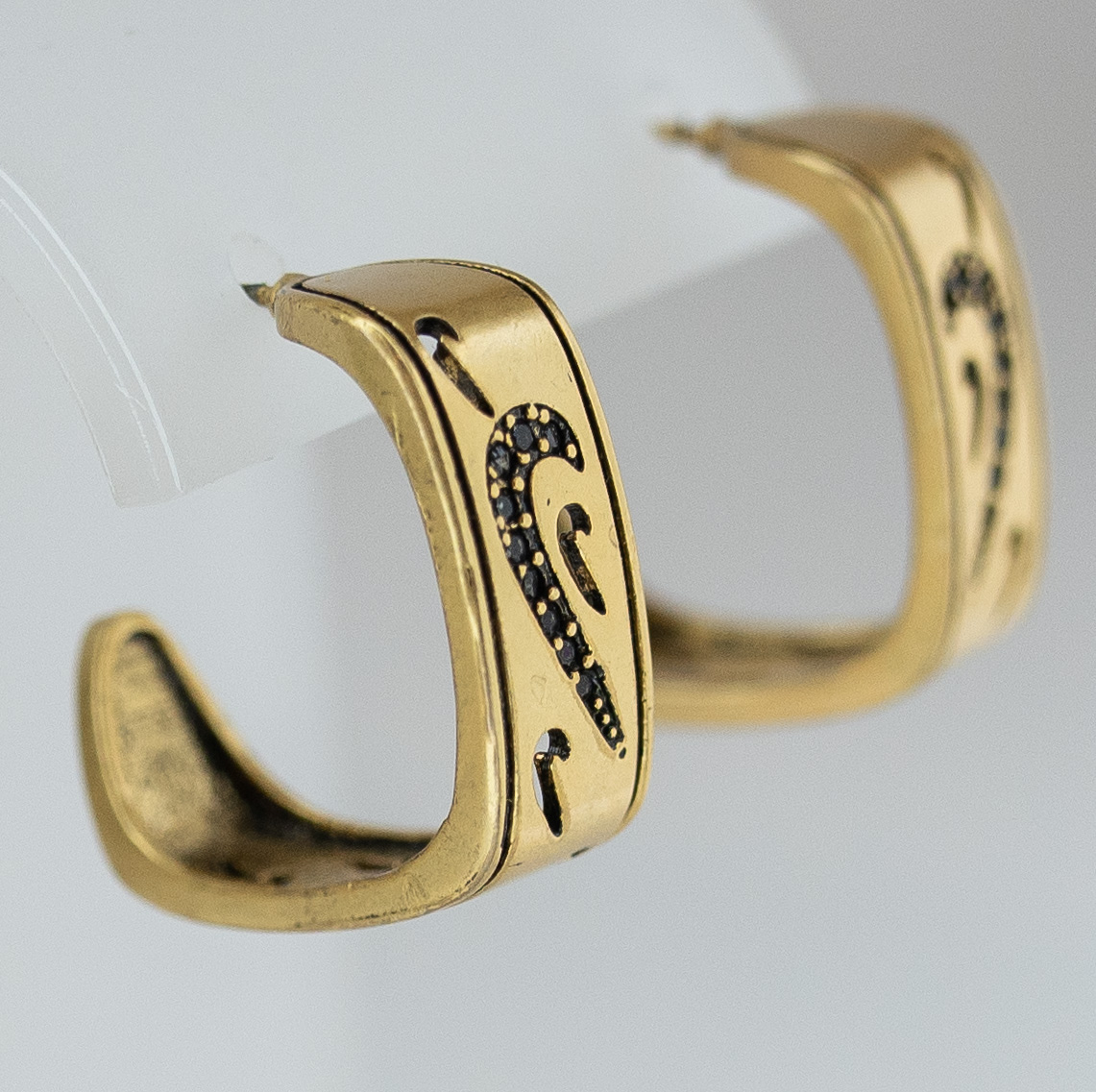 Серьги женские из гипоаллергенного ювелирного сплава желтого цвета. Вставка- ювелирное стекло черного цвета. Высота серег-2,0см, ширина- 1,0см. Застежка- пусет.