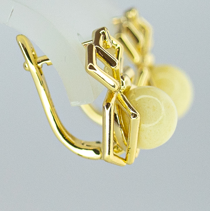 Серьги из гипоаллергенной бронзы с позолотой. Вставка- нат.янтарь белого цвета, размер камня( 0,8/0,8см). Высота серег-2,0см, ширина-2,0см. Застежка- английская (швенза-1,0см).