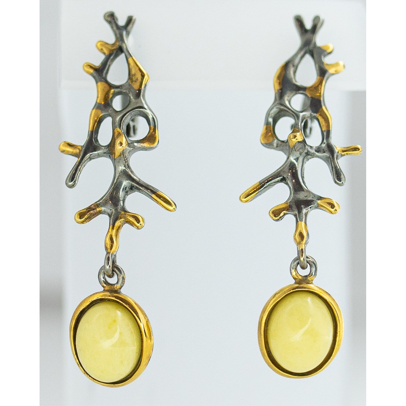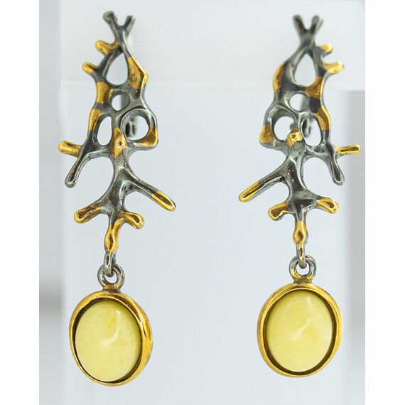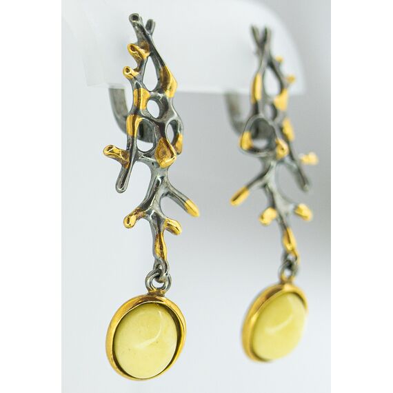 Серьги из гипоаллергенной бронзы с покрытием родием и позолотой. Вставка- нат.янтарь желтого цвета. Высота серег-4,0см, ширина-1,5см. Застежка- английская (швенза-1,0см).