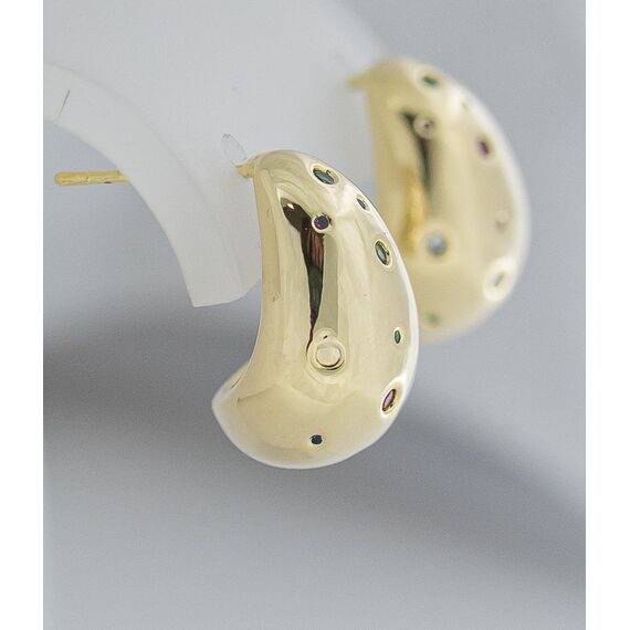 Серьги из гипоаллергенного ювелирного сплава, цвет-желтый. Вставка- ювелирное стекло, цвет-белый, зеленый, розовый. Высота серег-2,0см, ширина-1,5см. Застежка- пусет.
