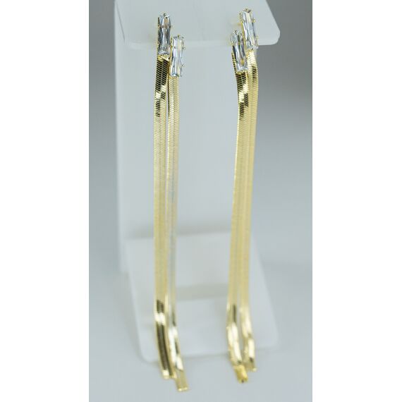 Серьги женские из гипоаллергенного ювелирного сплава желтого цвета. Без вставок. Представляют собой две скрепленные цепочки (плетение-плоский снейк), длиной-11,0см. Застежка- пусет.