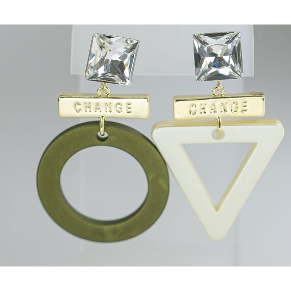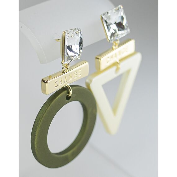 Моносерьги женские из гипоаллергенного ювелирного сплава желтого цвета и ювелирного пластика бежевого и болотного цвета. Вставка- кристалл белого цвета. Высота серег-3,5см, ширина-2,5см. Застежка- пусет.