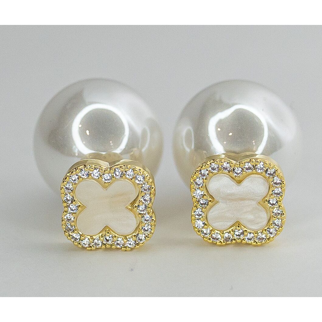Серьги двухсторонние женские из гипоаллергенного ювелирного сплава желтого цвета. Вставка- жемчуг и ювелирный пластик белого цвета. Диаметр серег-1,5см. Застежка-пусет.