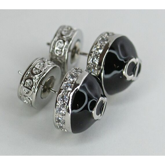 Серьги женские из гипоаллергенного ювелирного сплава серого цвета. Покрытие эмалью черного цвета. Вставка- ювелирное стекло белого цвета. Высота и ширина серег-1,0см. Застежка-пусет.