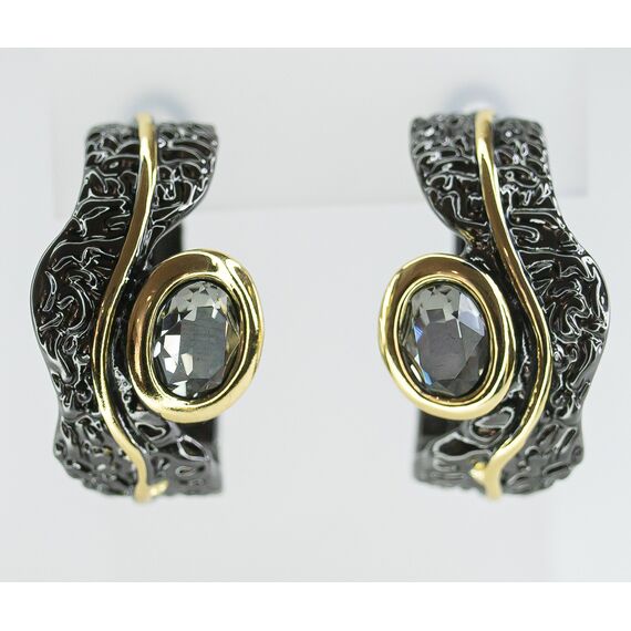 Серьги из гипоаллергенного ювелирного сплава черного и желтого цвета. Вставка- ювелирное стекло, цвет- серый. Высота серег-3,0см, ширина-1,5см. Итальянский замок (штифт-1,2см и клипса).
