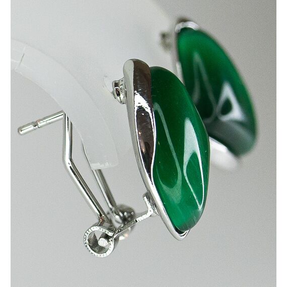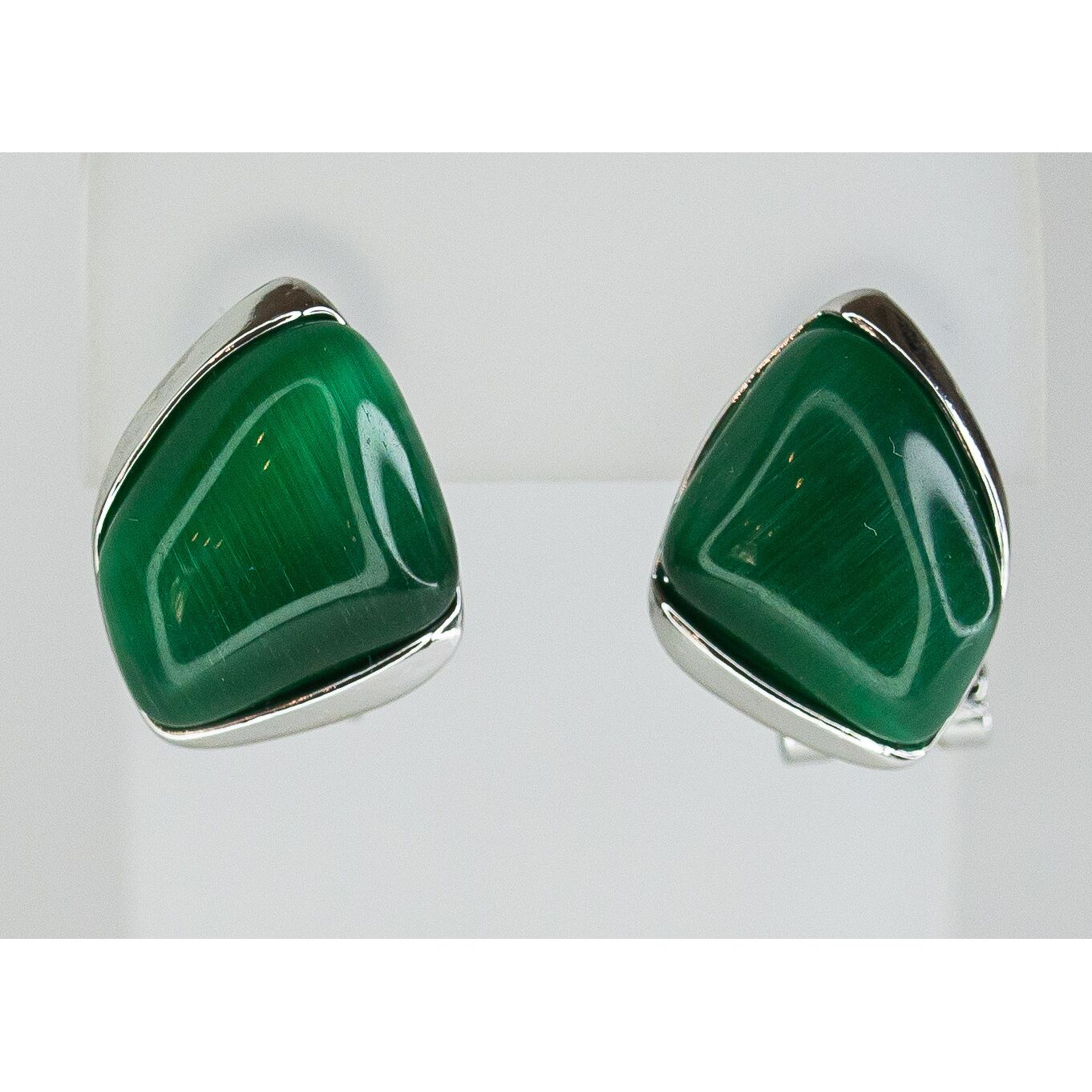 Серьги из гипоаллергенного ювелирного сплава серого цвета. Вставка- улексит ( кошачий глаз) зеленого цвета. Высота серег -2,0см, ширина -1,0см. Итальянский замок ( штифт-1,2см и клипса).