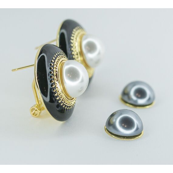 Серьги из гипоаллергенного ювелирного сплава желтого цвета. Вставка- жемчуг иск., цвет- белый и серый. Покрытие эмалью черного цвета. Высота серег-2,0см, ширина-2,0см. Итальянский замок (штифт-1,2см и клипса).