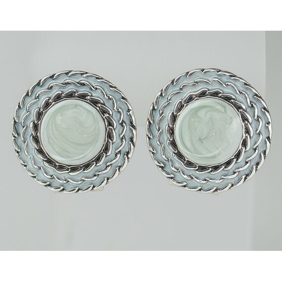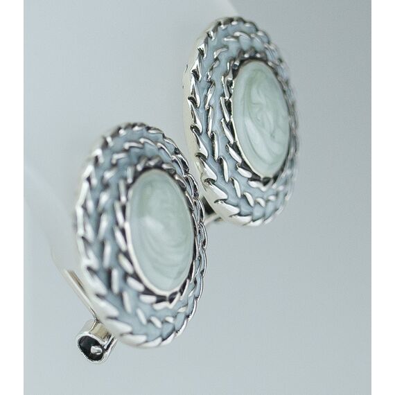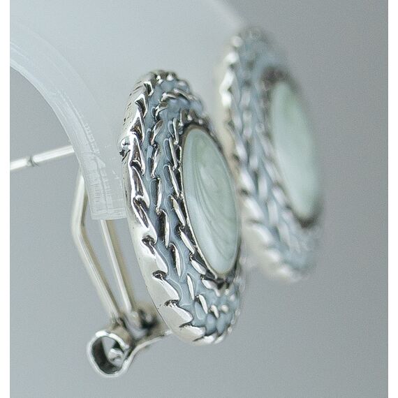 Серьги женские из гипоаллергенного ювелирного сплава серого цвета. Вставка- гелиотис(перламутр), цвет- серо-голубой. Высота серег- 2,0см, ширина-2,0см. Застежка- итальянская (штифт-1,2см и клипса).