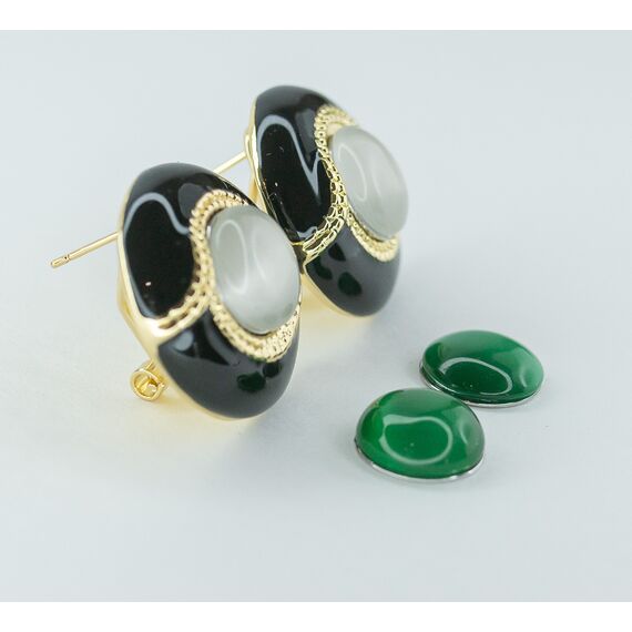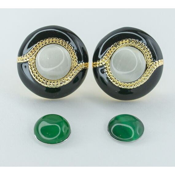 Серьги женские из гипоаллергенного ювелирного сплава желтого цвета. Вставка- улексит (кошачий глаз), цвет-зеленый и серый. Покрытие эмалью черного цвета. Высота серег- 2,0см, ширина-2,0см. Итальянский замок (штифт-1,2см и застежка- клипса).