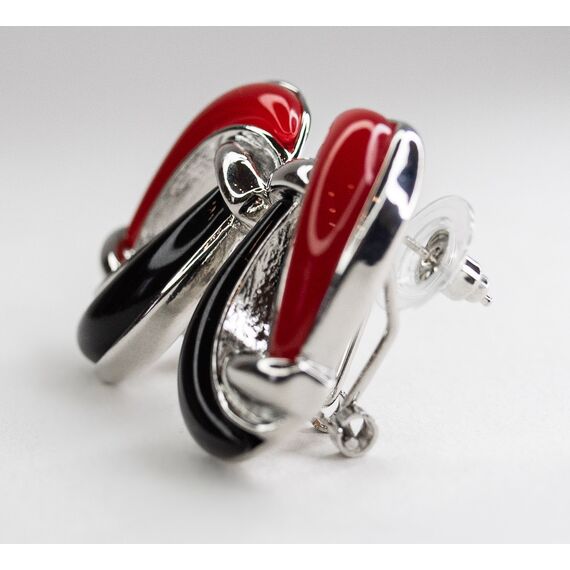 Серьги из гипоаллергенного ювелирного сплава серого цвета. Покрытие эмалью, цвет- черный и красный. Высота серег-3см, ширина-2см. Итальянский замок( штифт-1,2см и застежка-клипса)