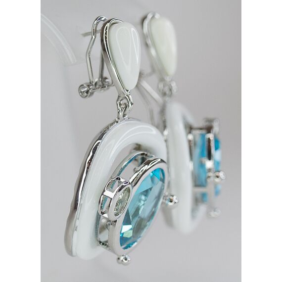 Серьги из гипоаллергенного ювелирного сплава серого цвета. Вставка- кварц,цвет-голубой и керамика белого цвета. Высота серёг-4,0см, ширина-3,0см. Итальянский замок( штифт-1,2см и застежка-клипса).