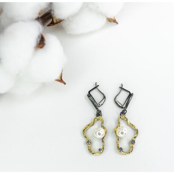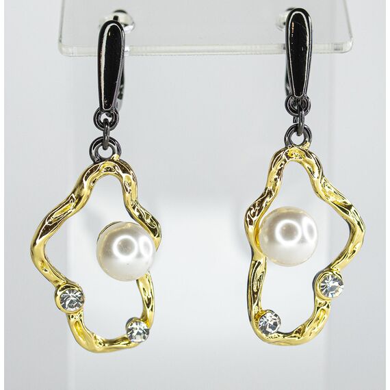 Серьги женские из гипоаллергенного ювелирного сплава черного и желтого цвета. Вставка- жемчуг иск. и ювелирное стекло белого цвета. Высота серег-4,0см, ширина-2,0см. Застежка- английская (штифт-1,0см).