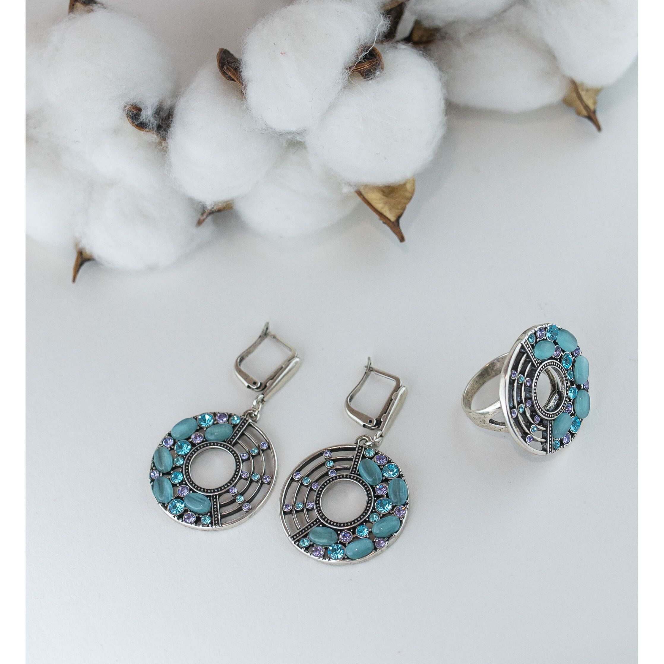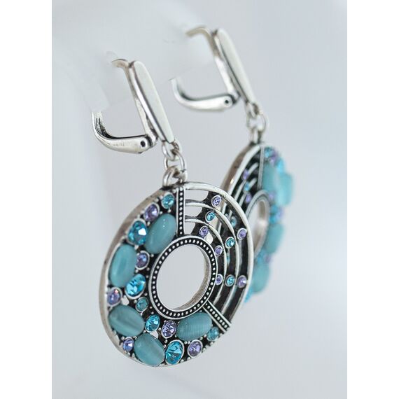 Серьги женские из гипоаллергенного ювелирного сплава серого цвета. Вставка- улексит (кошачий глаз) голубого цвета и ювелирное стекло голубого и фиолетового цвета. Высота серег-4,0см, ширина-3,0см. Английский замок (штифт-1,0см).