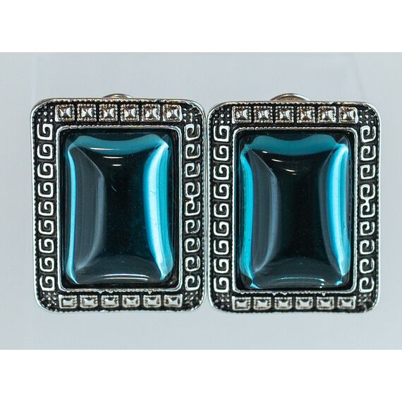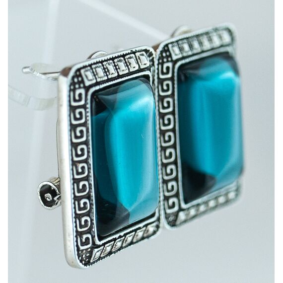 Серьги женские из гипоаллергенного ювелирного сплава серого цвета. Вставка- улексит (кошачий глаз) синего цвета. Высота серег-2,5см, ширина-2,0см. Итальянский замок (штифт-1,2см и застежка-клипса).
