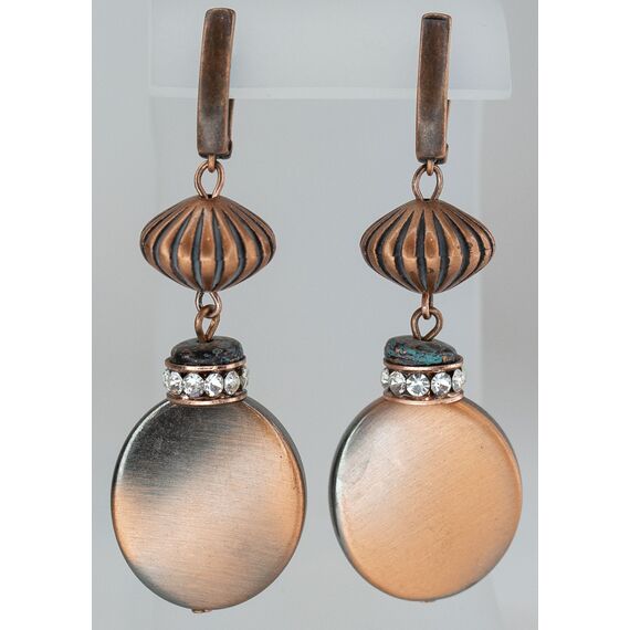 Серьги женские из гипоаллергенного ювелирного сплава бронзового цвета. Вставка- чешское стекло, цвет-белый и французский полимер бежевого цвета. Высота серег- 6,0см, ширина-1,5см. Английский замок (штифт-1,0см).