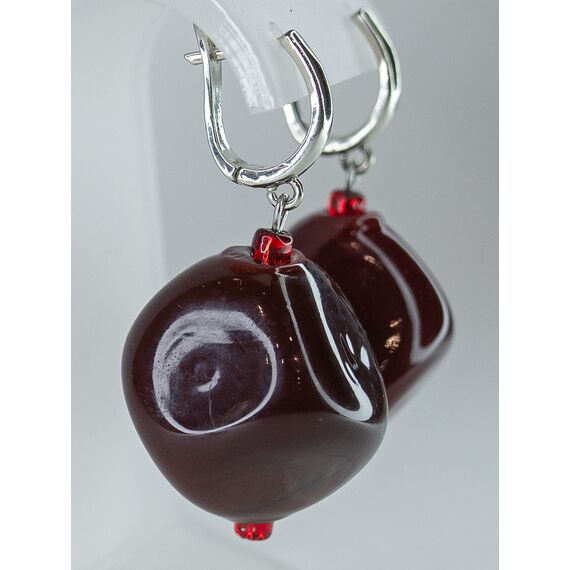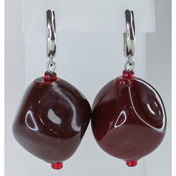 Серьги женские из гипоаллергенного ювелирного сплава серого цвета. Вставка- муранское стекло, цвет- красный. Высота серег--5,0см., ширина-2,5см. Замок- английский со штифом -1,0см.