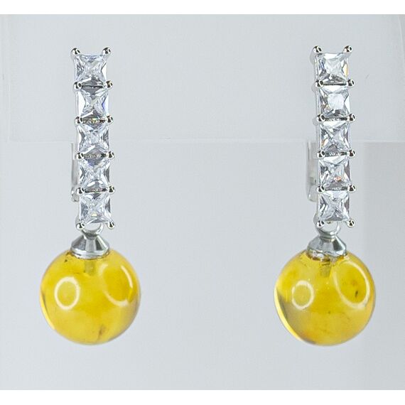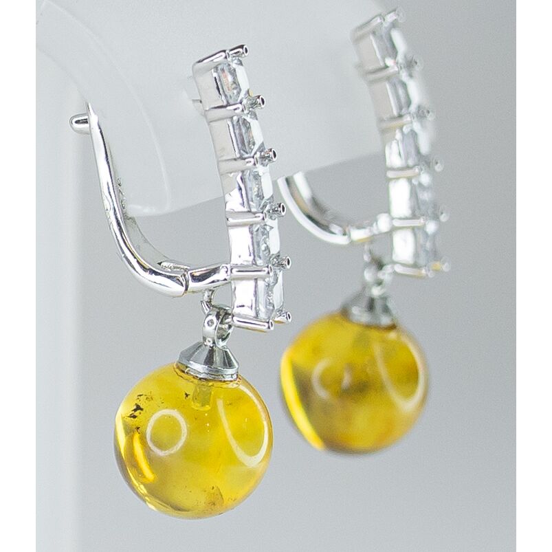Серьги из гипоаллергенного ювелирного сплава серого цвета. Вставка-натуральный янтарь, цвет- желтый и фианиты белого цвета. Высота серег-3,0см, ширина-1,0см. Застежка- английская (штифт-1,0см).