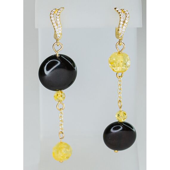 Серьги из гипоаллергенного ювелирного сплава желтого цвета. Вставка-натуральный янтарь, цвет- желтый, черный и фианиты белого цвета. Высота серег-6,0см, ширина-1,3см. Застежка- английская (штифт-1,0см).