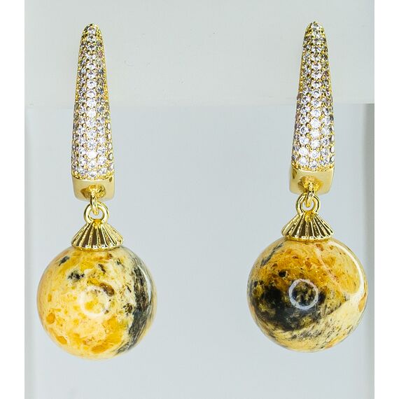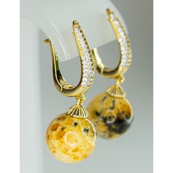 Серьги из гипоаллергенного ювелирного сплава желтого цвета. Вставка-натуральный янтарь, цвет- желтый с разводами и фианиты белого цвета. Высота серег-3,0см, ширина-1,0см. Застежка- английская (штифт-1,0см).