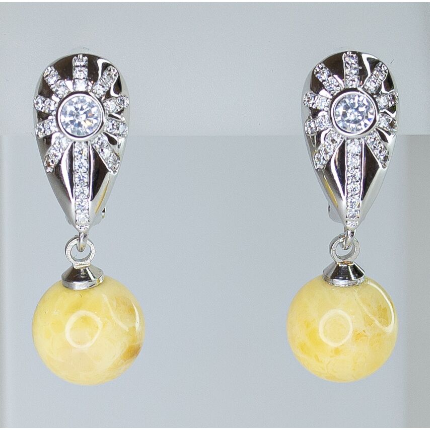 Серьги из гипоаллергенного ювелирного сплава серого цвета. Вставка-натуральный янтарь, цвет- желтый и фианиты белого цвета. Высота серег-3,0см, ширина-1,0см. Застежка- английская (штифт-1,0см).