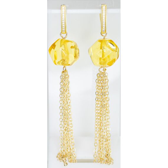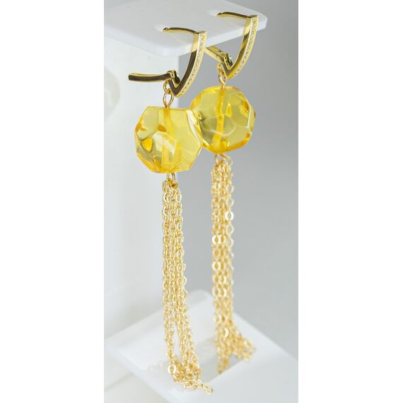 Серьги из гипоаллергенного ювелирного сплава желтого цвета. Вставка-натуральный янтарь, цвет- желтый. Высота серег-6,0см, ширина-1,0см. Застежка- английская (штифт-1,0см).