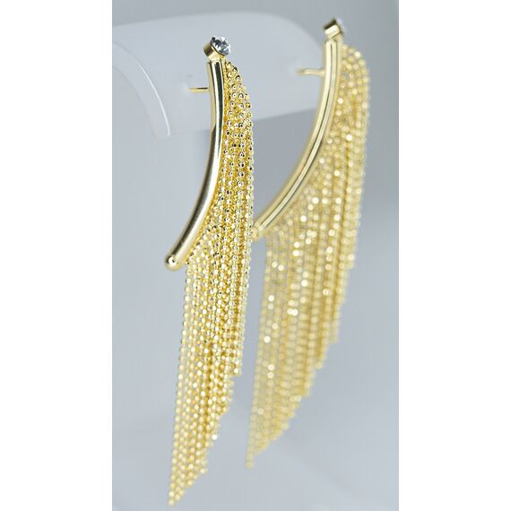 Серьги женские из гипоаллергенного ювелирного сплава желтого цвета. Вставка- циркон белого цвета. Высота серег- 6,0см, ширина-4,0см. Застежка- пусет.