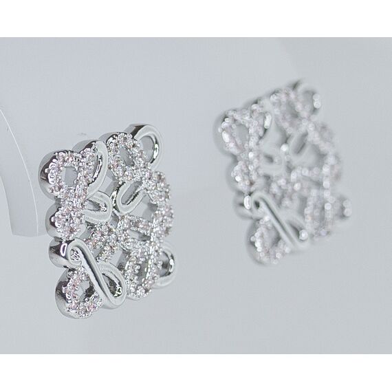 Серьги женские из гипоаллергенного ювелирного сплава серого цвета. Вставка- циркон белого цвета. Высота и ширина серег-1,5см. Застежка- пусет.