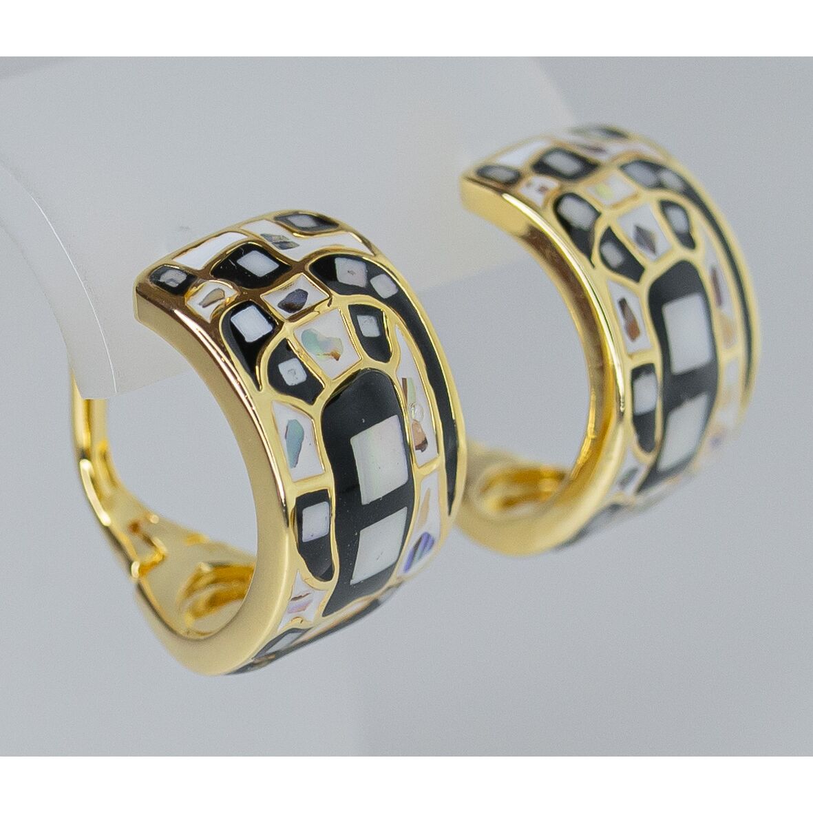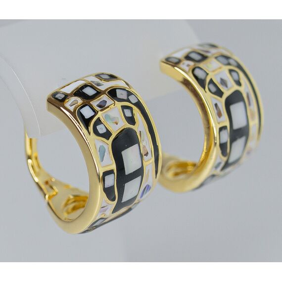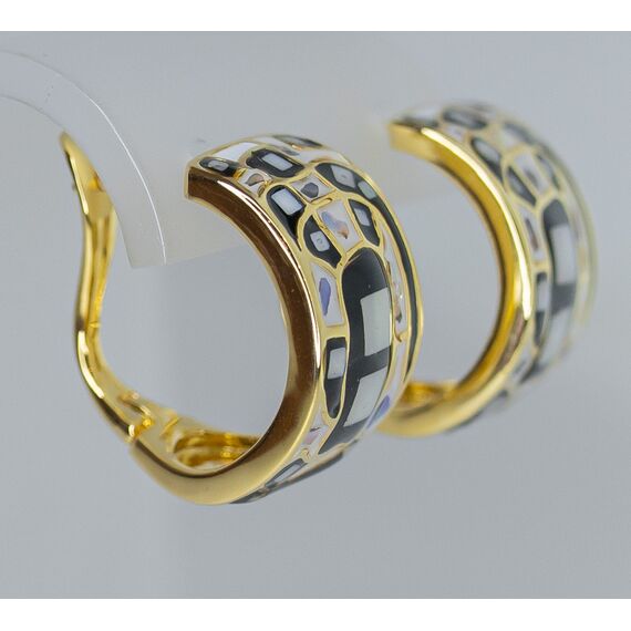 Серьги женские из гипоаллергенного ювелирного сплава желтого цвета. Вставка- гелиотис белого и черного цвета. Высота серег-3,0см, ширина -2,0см. Застежка- пусет.