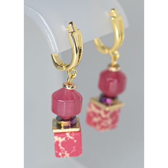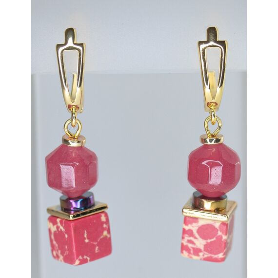 Серьги женские из гипоаллергенного ювелирного сплава желтого цвета. Вставка-варисцит розового и красного цвета, гематит, цвет- желтый. Высота серег-4,0см. Замок- английский (штифт-1,0см).