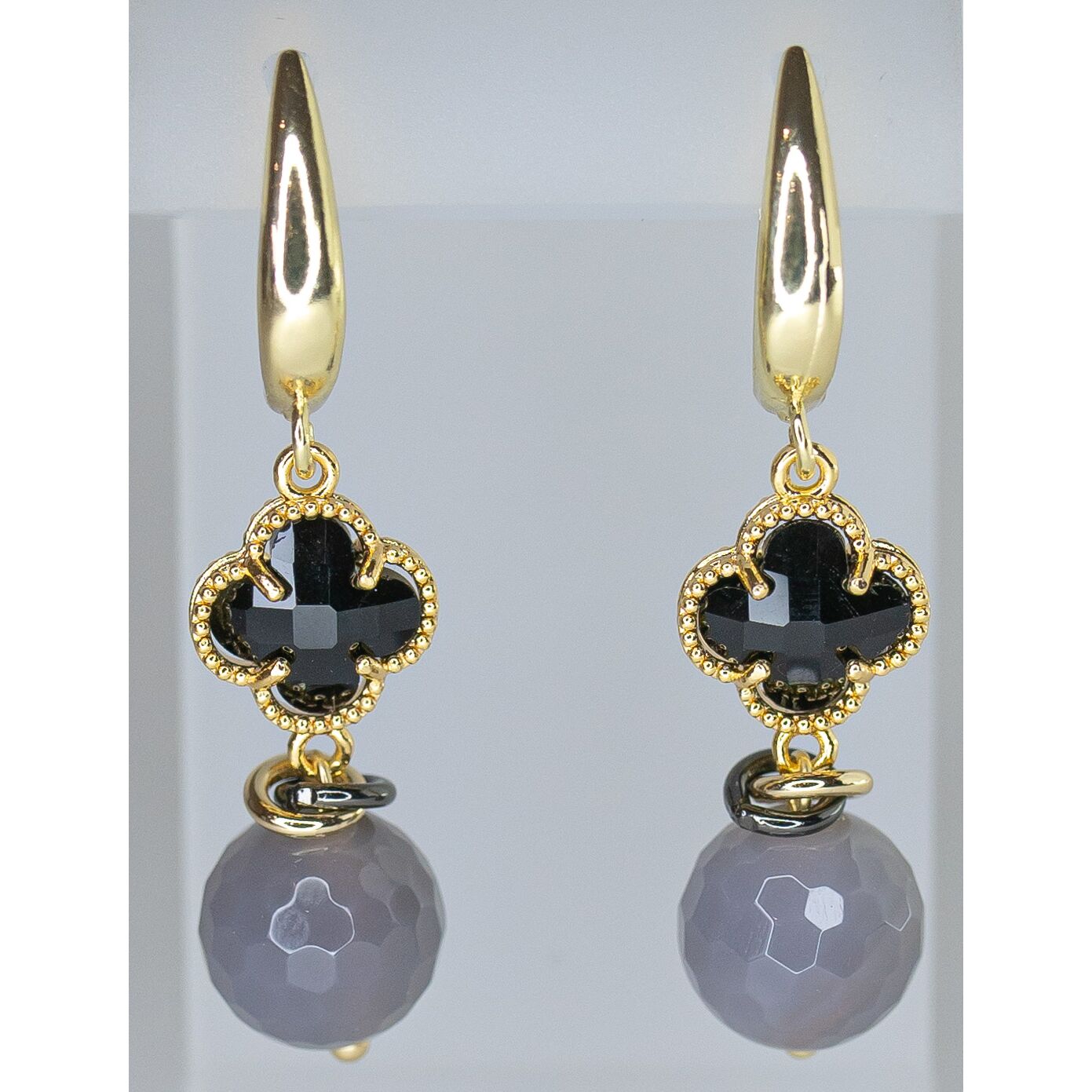 Серьги женские из гипоаллергенного ювелирного сплава желтого цвета. Вставка- халцедон серого и черного цвета. Высота серег-4,0см. Замок- английский (штифт-1,0см).