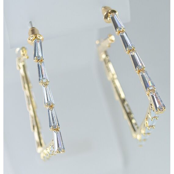 Серьги женские геометрической формы из гипоаллергенного ювелирного сплава желтого цвета. Вставка- ювелирное стекло белого цвета. Высота серег-4,0см, ширина-3,0см. Застежка- пусет.
