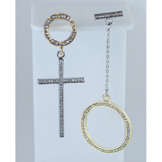 Серьги женские асимметричные из гипоаллергенного ювелирного сплава желтого и серого цвета. Вставка- ювелирное стекло белого цвета. Высота серег-5,0см, ширина-1,5см. Застежка- пусет.