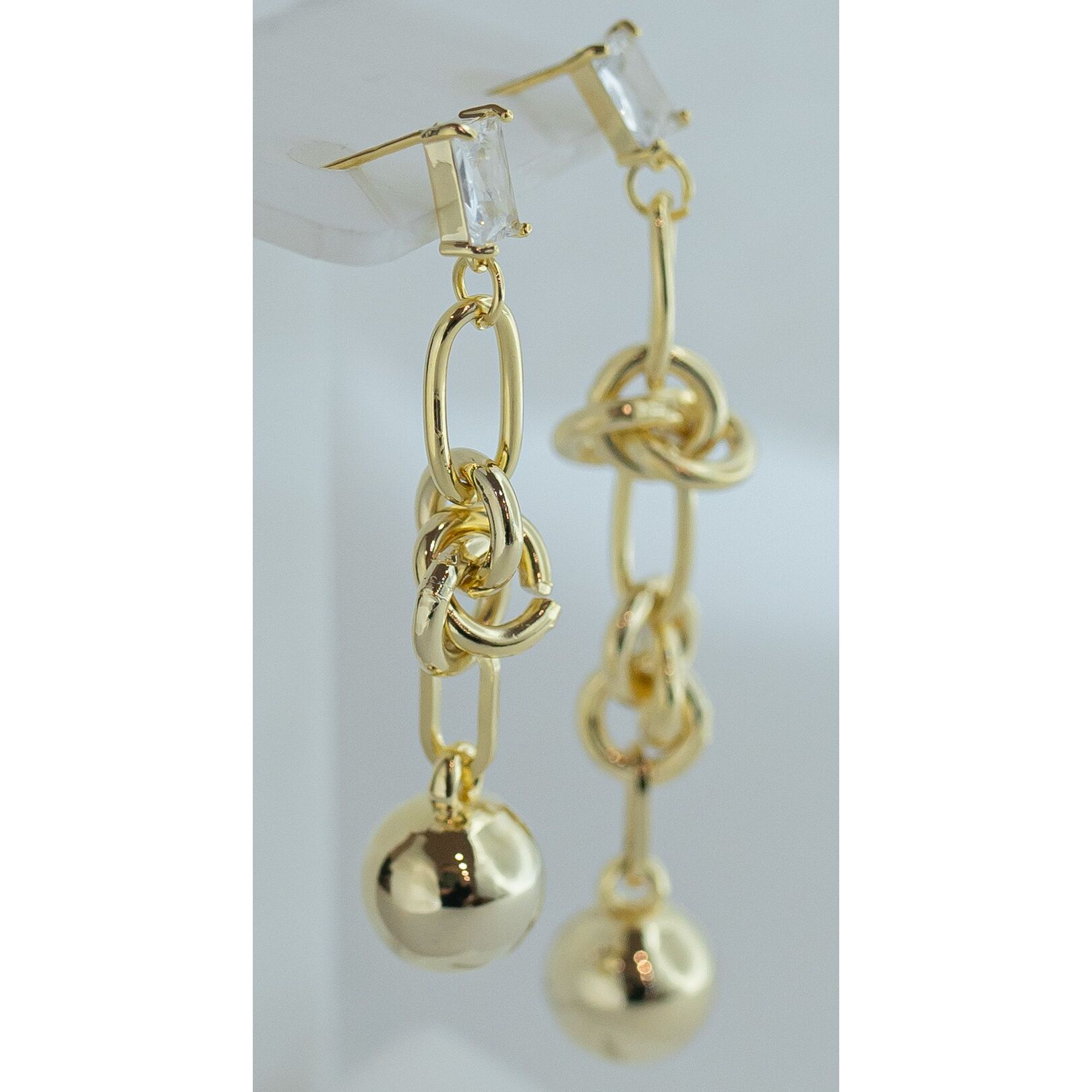 Серьги женские асимметричные из гипоаллергенного ювелирного сплава желтого цвета. Вставка- ювелирное стекло белого цвета. Высота серег-5,0см, ширина-1,0см. Застежка- пусет.
