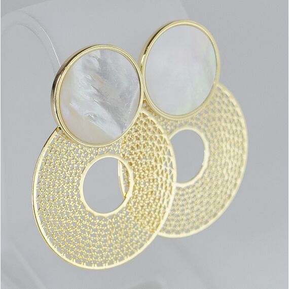 Серьги женские из гипоаллергенного ювелирного сплава желтого цвета. Вставка- перламутр, цвет- белый. Высота серег-5,0см, ширина-3,0см. Застежка- пусет.