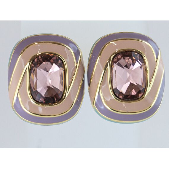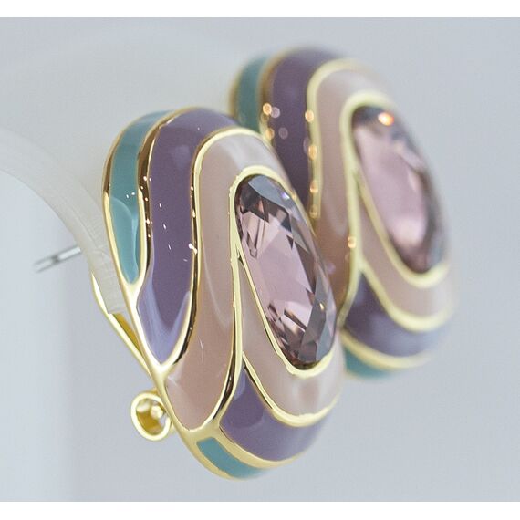 Серьги женские из гипоаллергенного ювелирного сплава желтого цвета. Вставка- сиреневый кварц. Покрытие эмалью розового и сиреневого цвета. Высота серег-2,5см, ширина-2,0см. Застежка- пусет.