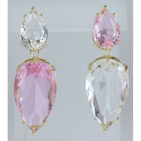 Серьги женские из гипоаллергенного ювелирного сплава желтого цвета. Вставка- ювелирное стекло белого и розового цвета. Высота серег-4,0см, ширина-1,5см. Застежка- пусет.