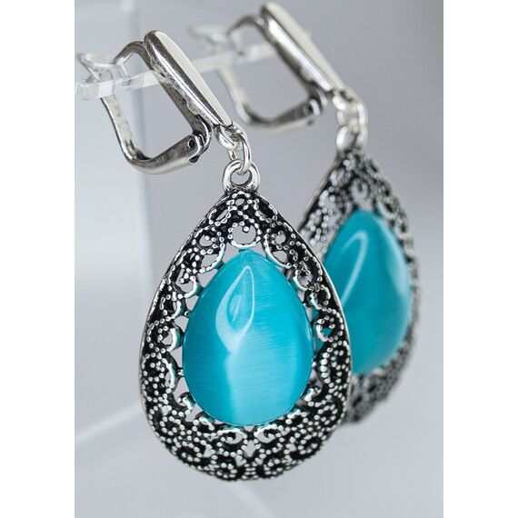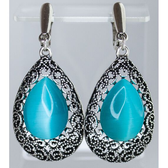Серьги женские из гипоаллергенного ювелирного сплава серого цвета. Вставка- улексит (кошачий глаз), цвет-голубой. Высота серег- 4,0см, ширина- 2,0см. Английский замок (штифт-1,0см).