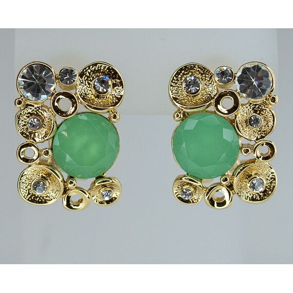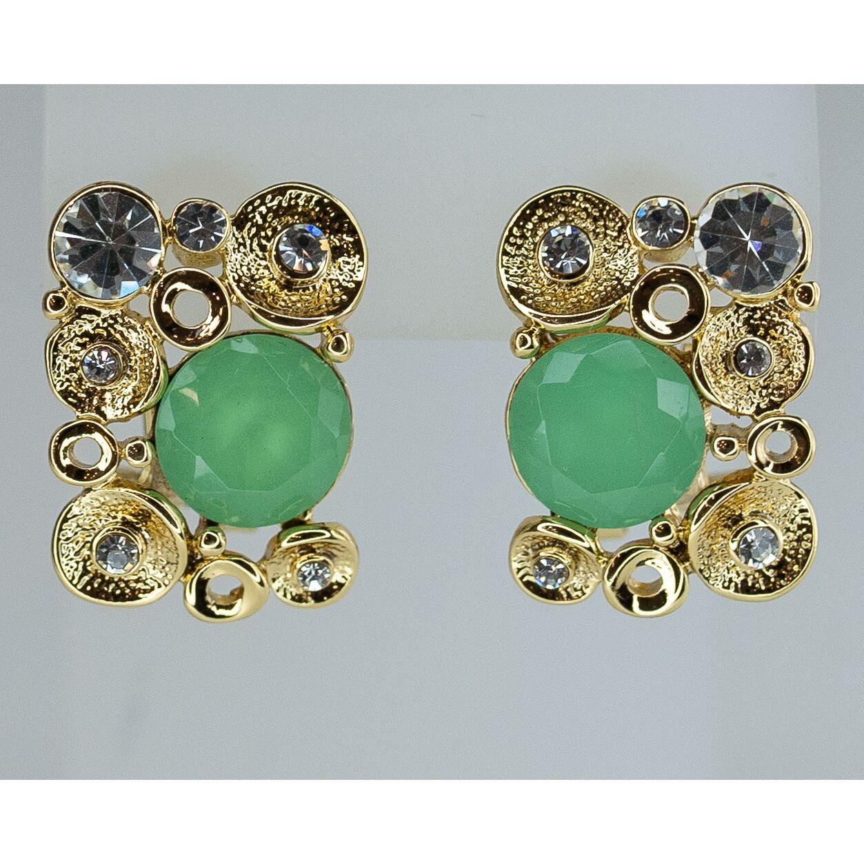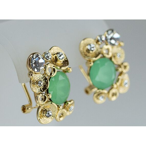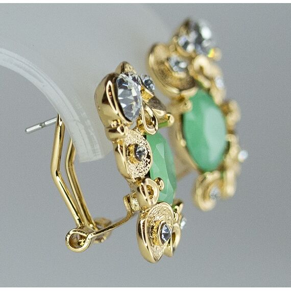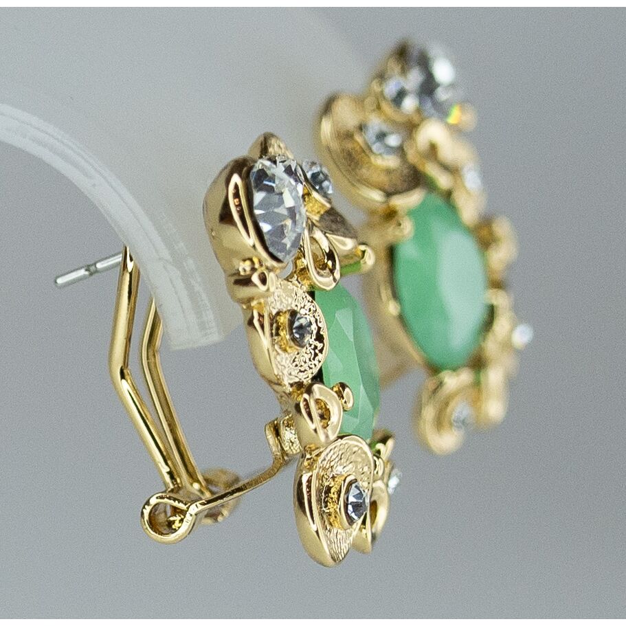 Серьги женские из гипоаллергенного ювелирного сплава желтого цвета. Вставка- кварц, цвет- белый и зеленый. Высота серег- 2,0см, ширина- 1,6см. Итальянский замок (штифт-1,2см и клипса).