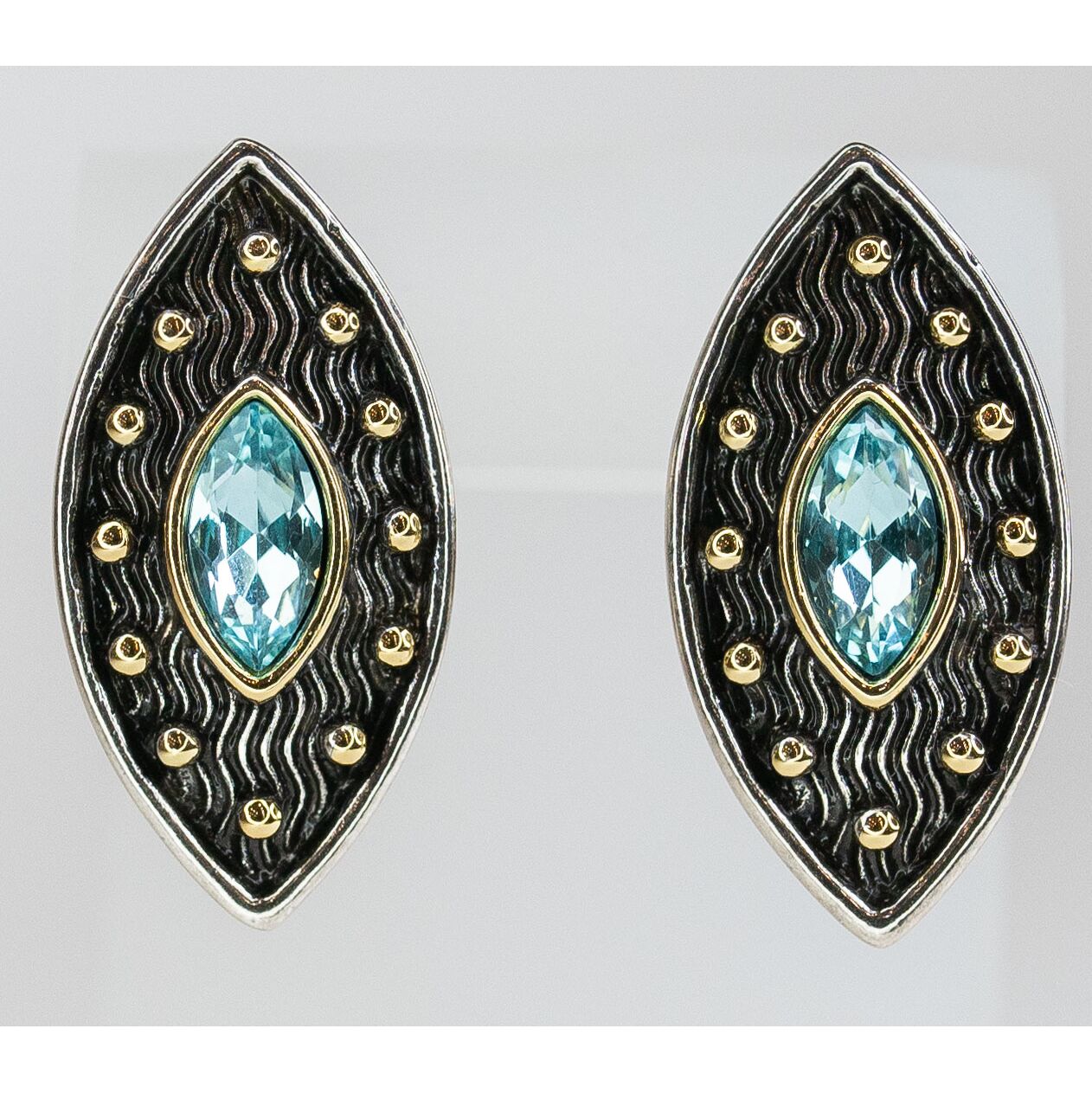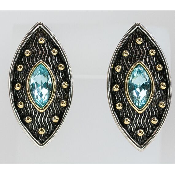 Серьги женские из гипоаллергенного ювелирного сплава желтого и серого цвета. Вставка- кварц, цвет- голубой. Высота серег- 3,0см, ширина- 1,5см. Итальянский замок (штифт-1,2см и клипса).