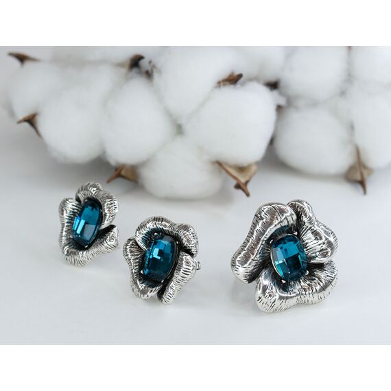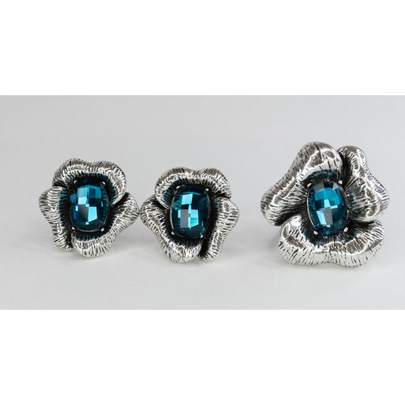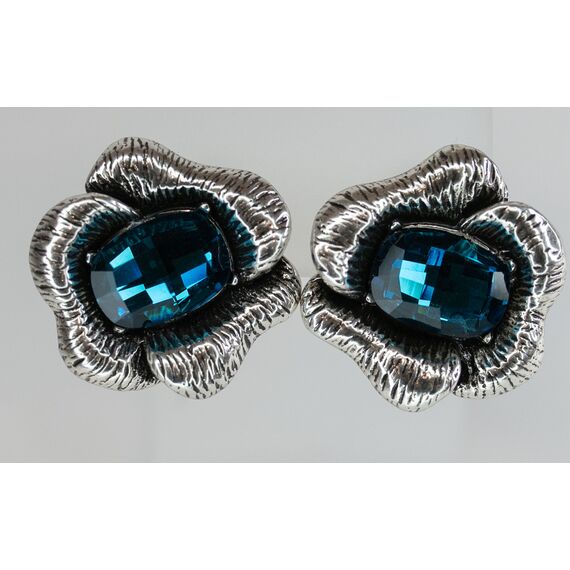 Серьги женские из гипоаллергенного ювелирного сплава серого цвета. Вставка- кварц синего цвета. Высота серег- 2,0см, ширина-2,0см. Итальянский замок (штифт-1,2см и застежка- клипса).