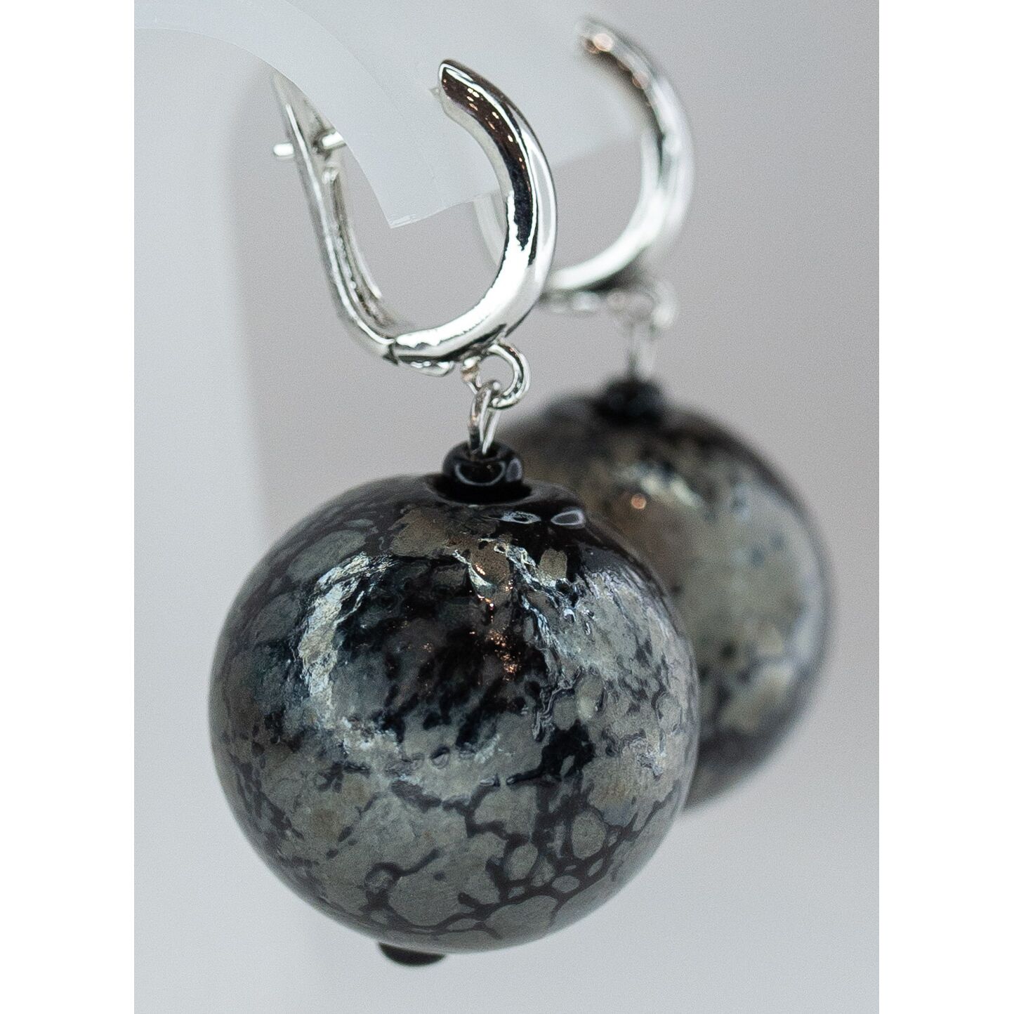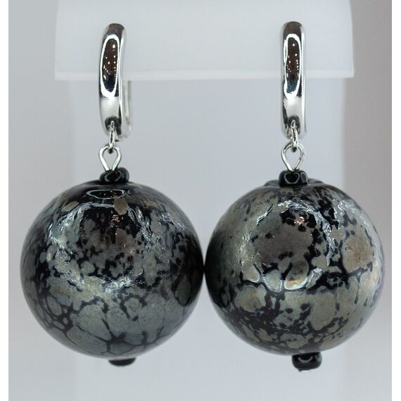 Серьги женские из муранского стекла, цвет- серый, черный и гипоаллергенного ювелирного сплава желтого цвета. Высота серег-3,0см, ширина-2,0см. Застежка- английская (штифт-1,0см).
